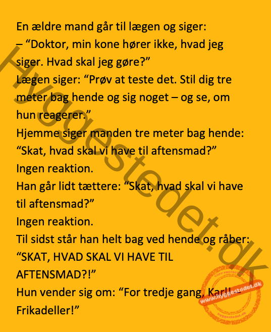 En ældre mand går til lægen og siger:– “Doktor, min kone hører ikke, hvad jeg siger” FacebookTwitterPinterestWhatsApp SCROLL NED FOR FLERE SJOVE JOKES! :)