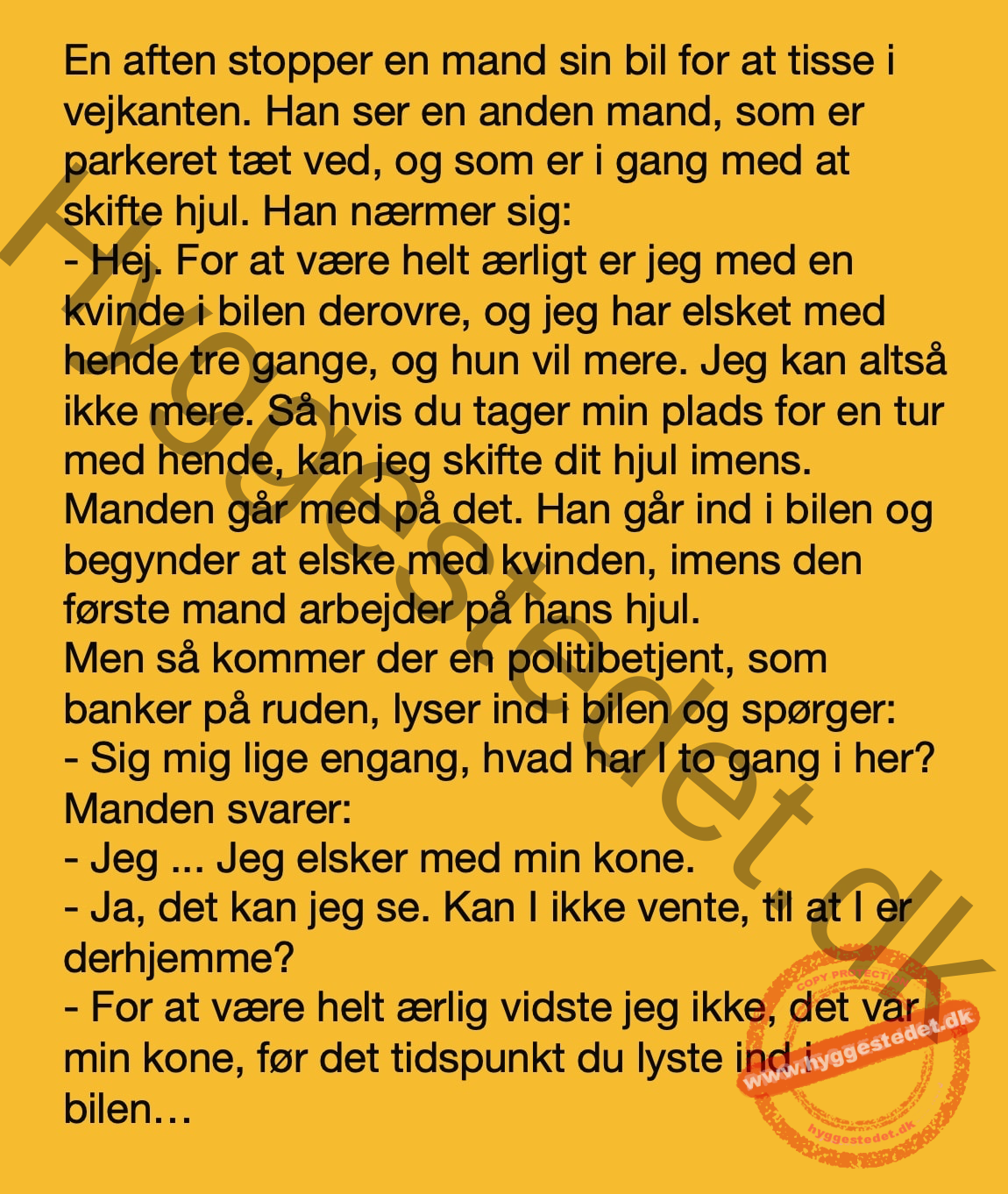En aften stopper en mand sin bil for at tisse i vejkanten….. FacebookTwitterPinterestWhatsApp SCROLL NED FOR FLERE SJOVE JOKES! :)