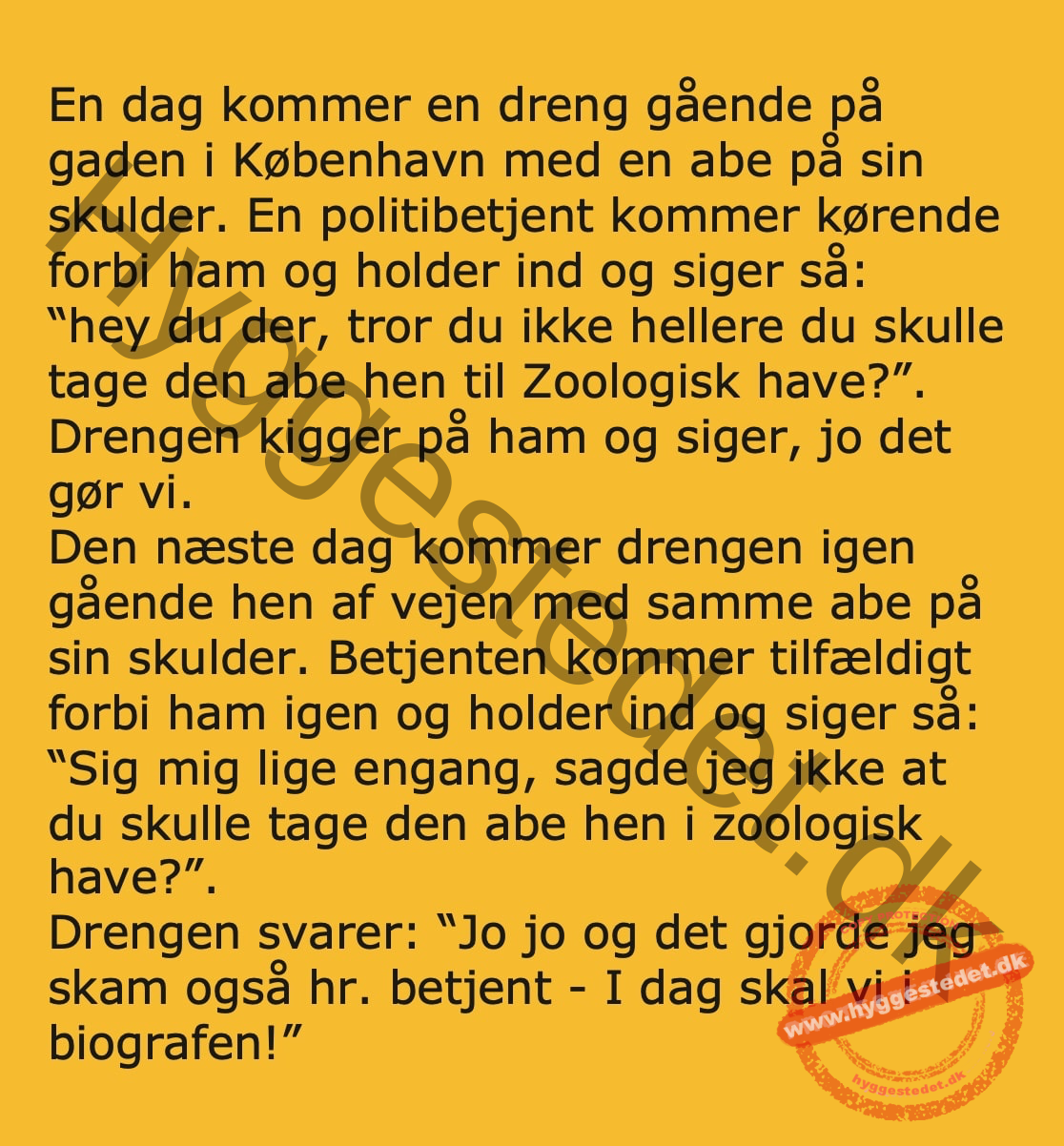 En dag kommer en dreng gående på gaden i København med en abe på sin skulder FacebookTwitterPinterestWhatsApp SCROLL NED FOR FLERE SJOVE JOKES! :)