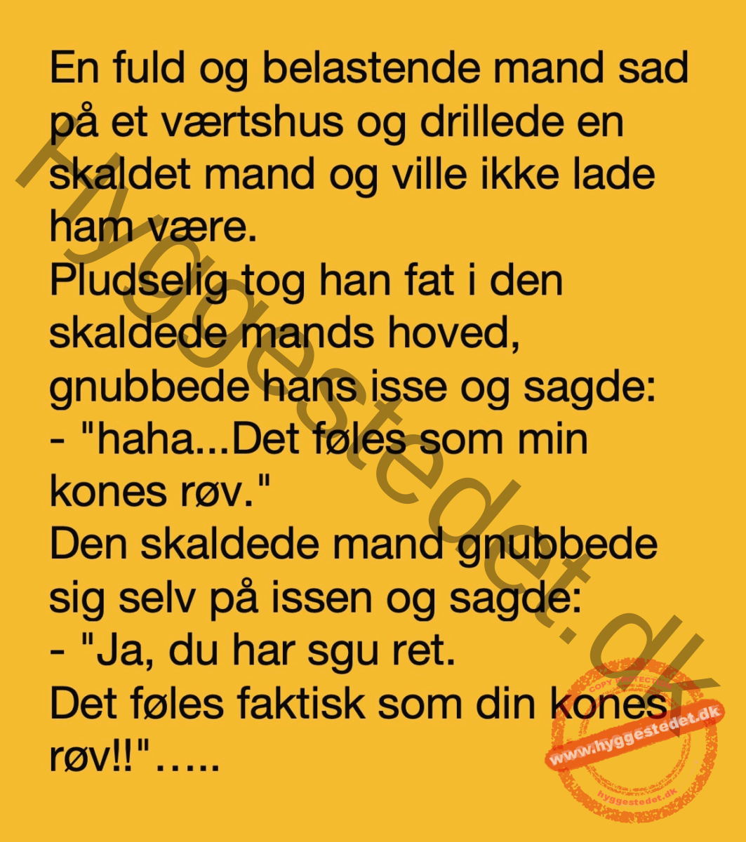 En fuld og belastende mand sad på et værtshus og drillede en skaldet mand … FacebookTwitterPinterestWhatsApp SCROLL NED FOR FLERE SJOVE JOKES! :)