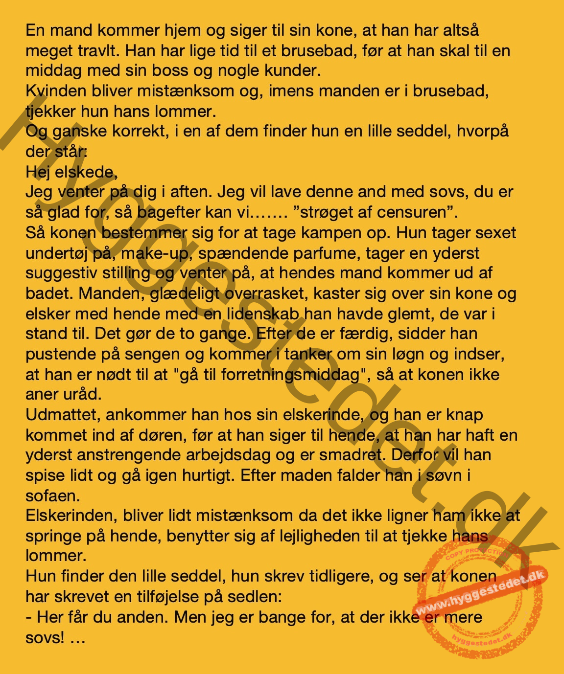 En mand kommer hjem til sin kone, men skal hurtigt afsted igen til sin elskerinde… FacebookTwitterPinterestWhatsApp SCROLL NED FOR FLERE SJOVE JOKES! :)