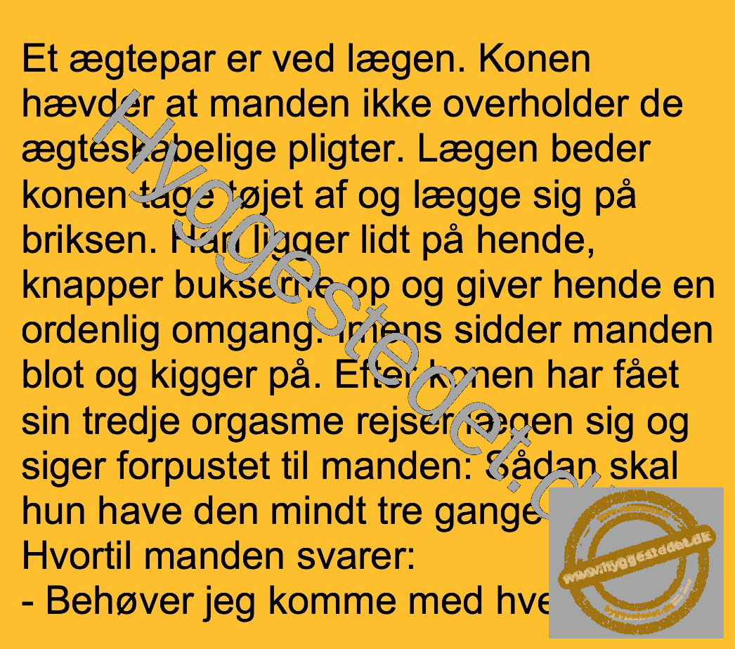 Et ægtepar er ved lægen da konen ikke mener at manden overholder de ægteskabelige pligter.. FacebookTwitterPinterestWhatsApp SCROLL NED FOR FLERE SJOVE JOKES! :)