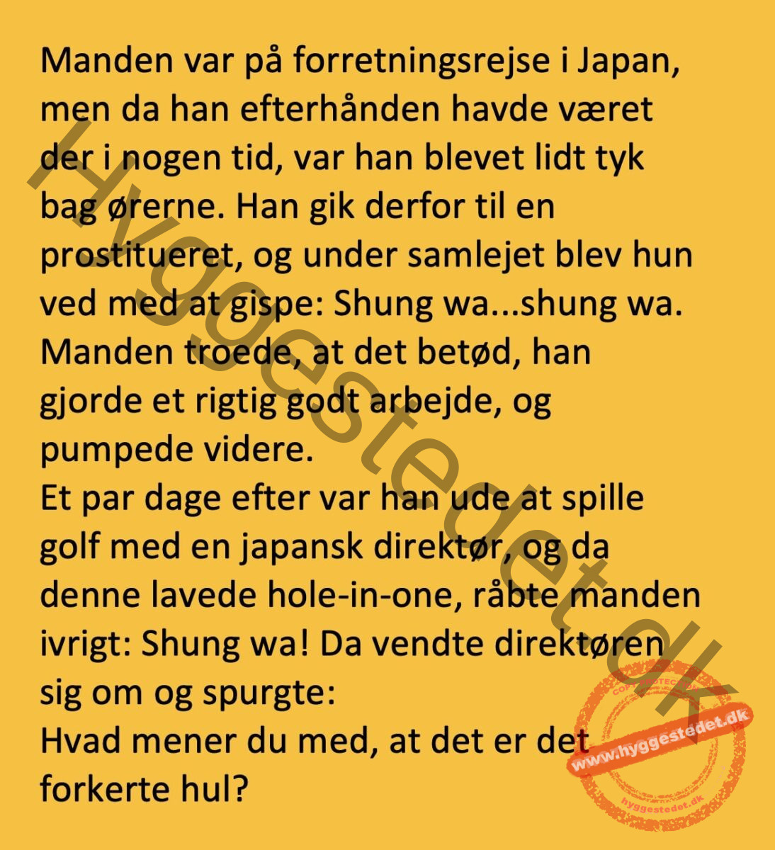 En mand var på forretningsrejse i Japan og var blevet lidt tyk bag ørerne…. FacebookTwitterPinterestWhatsApp SCROLL NED FOR FLERE SJOVE JOKES! :)