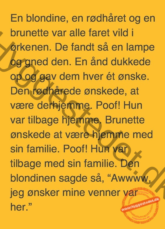 En blondine, en rødhåret og en brunette var faret vild i ørkenen… FacebookTwitterPinterestWhatsApp SCROLL NED FOR FLERE SJOVE JOKES! :)