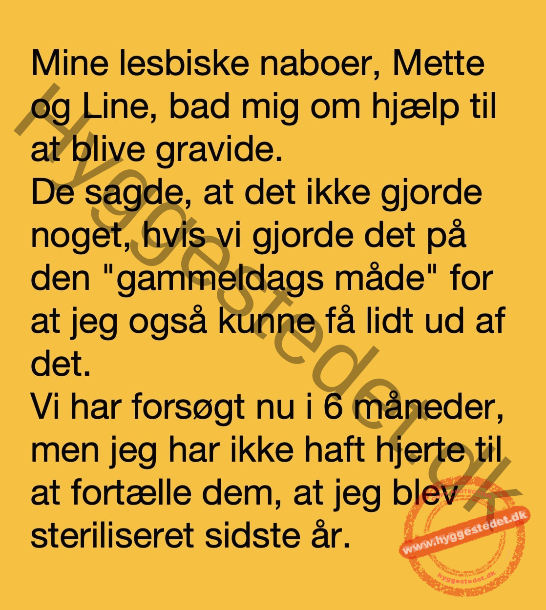 Mine lesbiske naboer, Mette og Line, bad mig om hjælp til at blive gravide…. FacebookTwitterPinterestWhatsApp SCROLL NED FOR FLERE SJOVE JOKES! :)