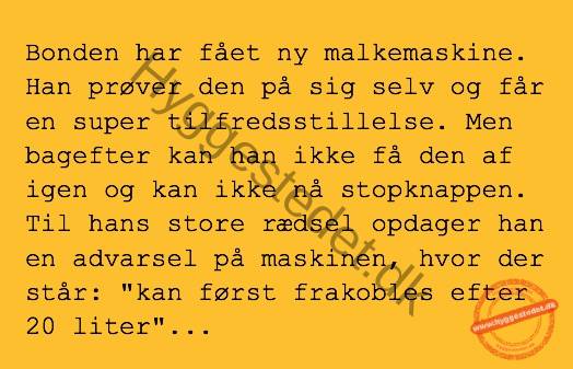 Bonden havde fået ny malkemaskine og ville lige teste den på sig selv FacebookTwitterPinterestWhatsApp SCROLL NED FOR FLERE SJOVE JOKES! :)