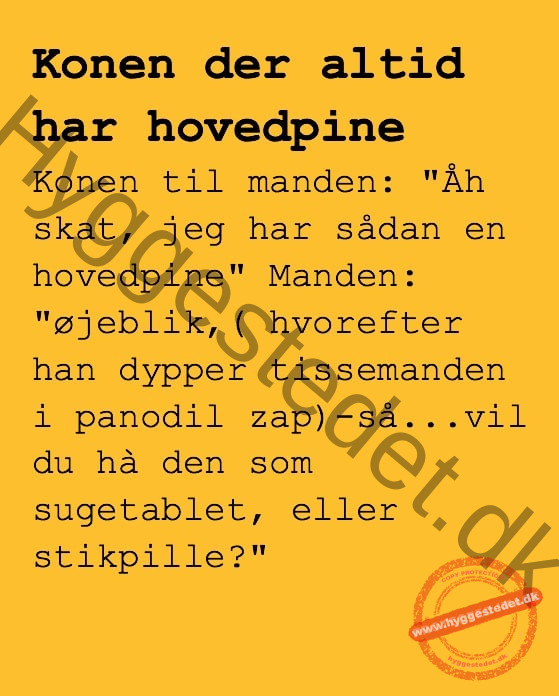 Konen der altid har hovedpine når de skal til at hygge… FacebookTwitterPinterestWhatsApp SCROLL NED FOR FLERE SJOVE JOKES! :)