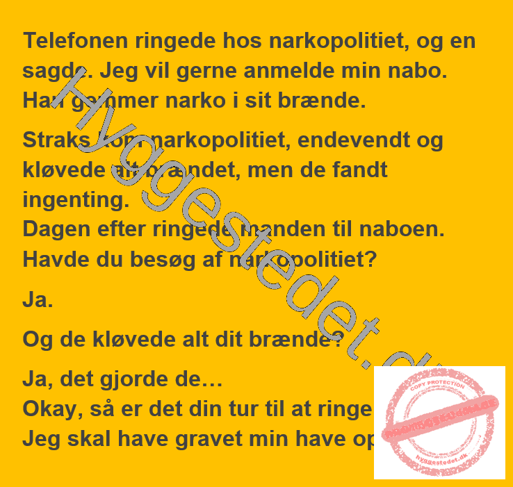 Telefonen ringede hos narkopolitiet, Jeg vil gerne anmelde min nabo – han gemmer narko i sit brænde FacebookTwitterPinterestWhatsApp SCROLL NED FOR FLERE SJOVE JOKES! :)